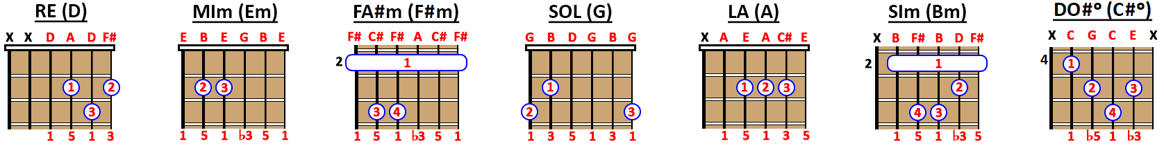 Re (I) – Mim (ii) – Fa#m (iii) – Sol (IV) – La (V) – Sim (vi) – Doº (viiº)